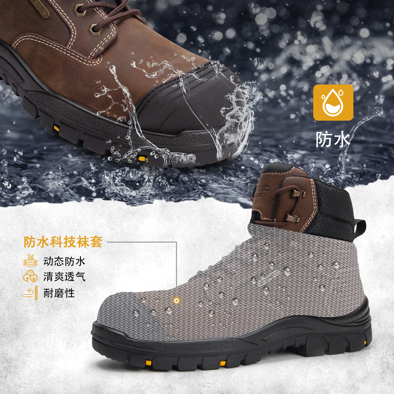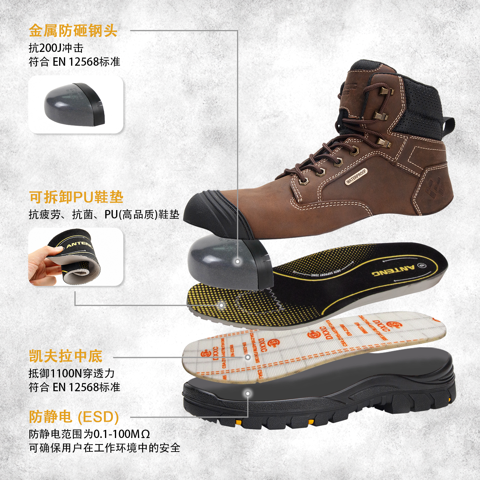 ANTENG男士防水工作靴真皮帮面橡胶大底 S3 ESD